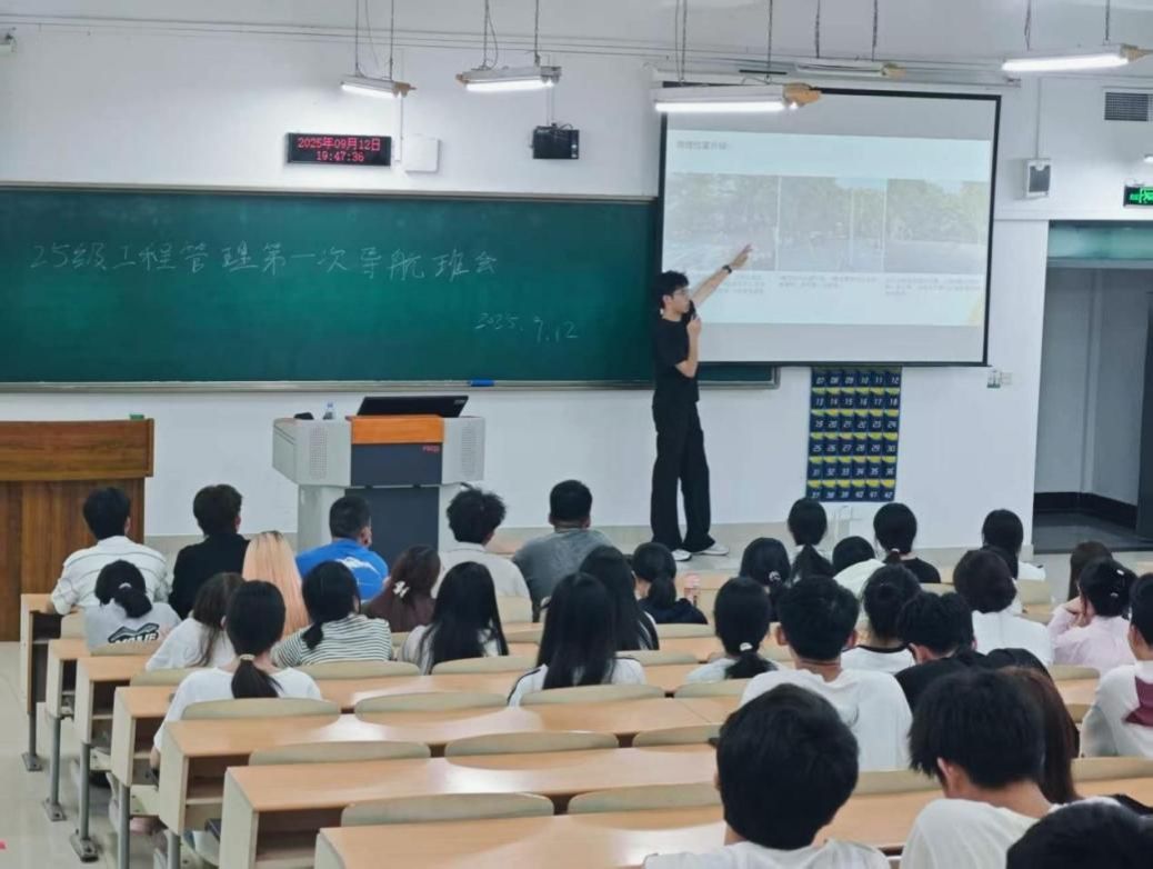 丹桂飘香,秋意渐浓,重庆工商大学管理科学与工程学院迎来了2025级新生。为帮助大一新生尽快适应大学环境,管理科学与工程学院设立“学长导航计划”,从物流管理、电子商务、工程管理、大数据管理与应用四个专业的高年级学生中选拔综合能力突出的学生担任导航学长为对应专业的大一新生进行多维适应性教育,引导大一新生适应大学生活。2025年9月,导航学长结合专业特点、新生情况、学院特色,通过导航班会的形式分享经验和提供针对性指导,助力新生完成高中生至大学生的角色转变。