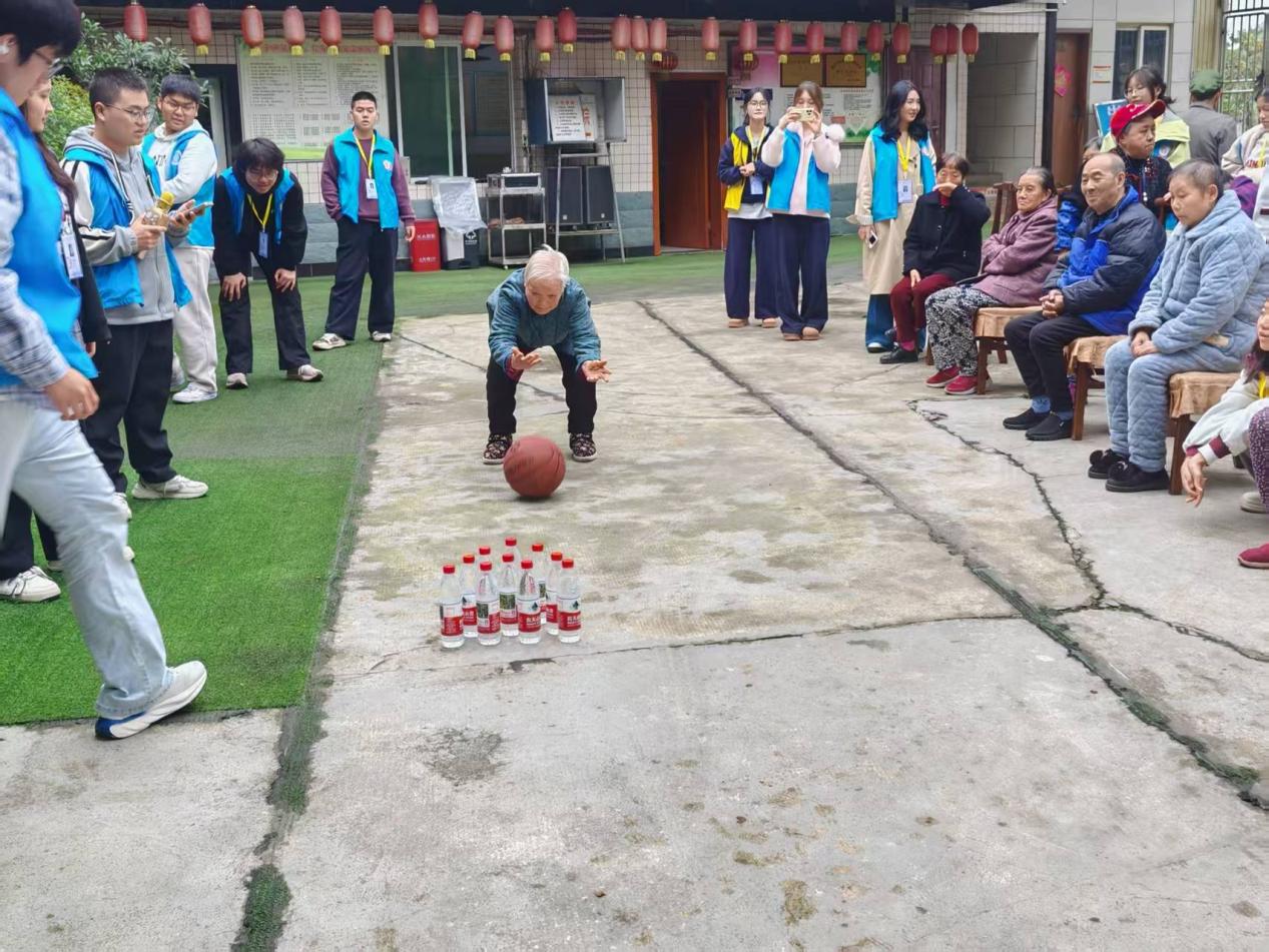 文艺表演结束后,互动游戏环节热闹开启。室外保龄球游戏中,老人们站在指定位置轻轻推出篮球,志愿者现场报分,无论得分高低,大家都乐在其中;气球传福不落地游戏里,老人们围坐成圈传递气球,音乐停歇时,手持气球的老人分享着温馨祝福,欢声笑语弥漫在养老院的每个角落。游戏间隙,陪伴组的志愿者们主动与老人们促膝长谈,倾听他们的过往经历,关心他们的生活起居,用真诚的陪伴温暖着老人们的心。活动尾声,护送组细心搀扶老人返回住处,收拾场地组则有条不紊地清理现场,确保环境整洁。