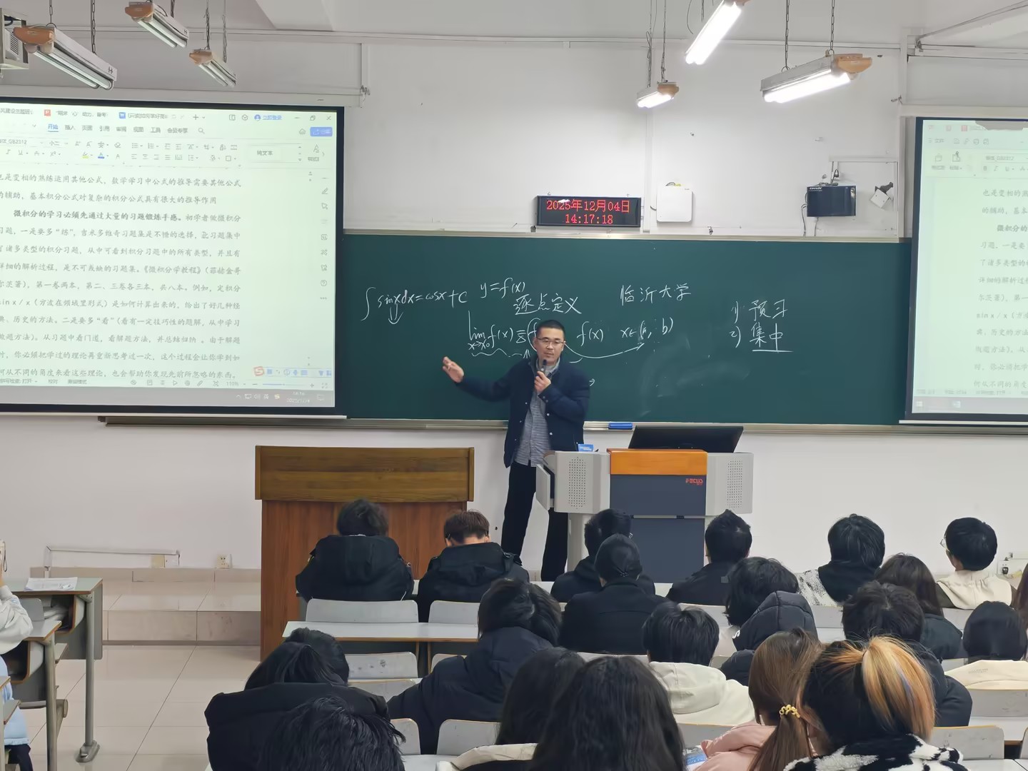 作为本次班会的重点环节,数统学院张付臣教授结合学科特点,围绕“高效学习数学”主题展开专项指导。针对同学们普遍关注的数学学习难点,李老师从预习、课中、课后复习三个核心环节逐一拆解:“预习不是简单看课本,要带着‘找疑问’的心态标注重点,比如在预习微分方程章节时,提前梳理变量分离法的基本逻辑,带着疑问听课效率会提升50%;课中要紧跟我的推导思路,重点记录公式的推导过程而非仅记结论,这对期末解答综合题至关重要;课后复习要建立‘错题本+知识点框架’双体系,每周整理3-5道典型错题,标注错误原因和解题思路,同时用思维导图梳理章节关联,避免知识点碎片化。”此外,张付臣老师还分享了期末复习技巧,建议大家以分“基础题突破—中档题强化—难题攻坚”三个阶段推进,每天保证1.5小时专项练习,优先掌握课本例题和课后习题涉及的基础知识点。张付臣老师还结合自身教学经验,以“态度决定复习高度”为主题与同学们互动。“部分同学觉得‘期末临时抱佛脚就行’,这种心态要不得。”李老师举例说明,微积分学科的连贯性极强,导数的掌握直接影响积分学习,前期基础不扎实会导致期末复习事倍功半。他鼓励同学们树立“循序渐进”的复习理念,制定每日复习计划表,明确各时段学习任务,通过班级学习小组相互监督、共同进步。现场同学积极回应,纷纷表示将调整学习状态,摒弃侥幸心理,扎实推进复习。