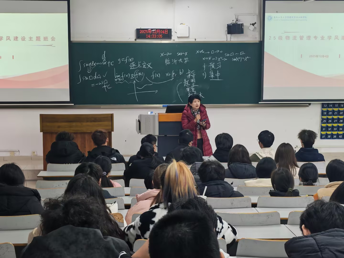 物流系主任龚英教授则从专业视角为同学们答疑解惑,将学风建设与专业发展紧密结合。龚英主任介绍了物流管理专业的核心课程体系、就业前景及行业对专业能力的要求,强调“大一微积分等基础课程是后续《物流运筹学》《供应链管理》等专业课程的学习基础,期末复习不仅是应对考试,更是为专业能力筑牢根基。”针对同学们提出的“专业学习方向不明确”“如何平衡基础课与专业兴趣学习”等问题,龚主任逐一解答,并建议大家在期末复习之余,通过查阅专业期刊、关注物流行业头部企业动态等方式增进专业认知,为后续学习明确方向。