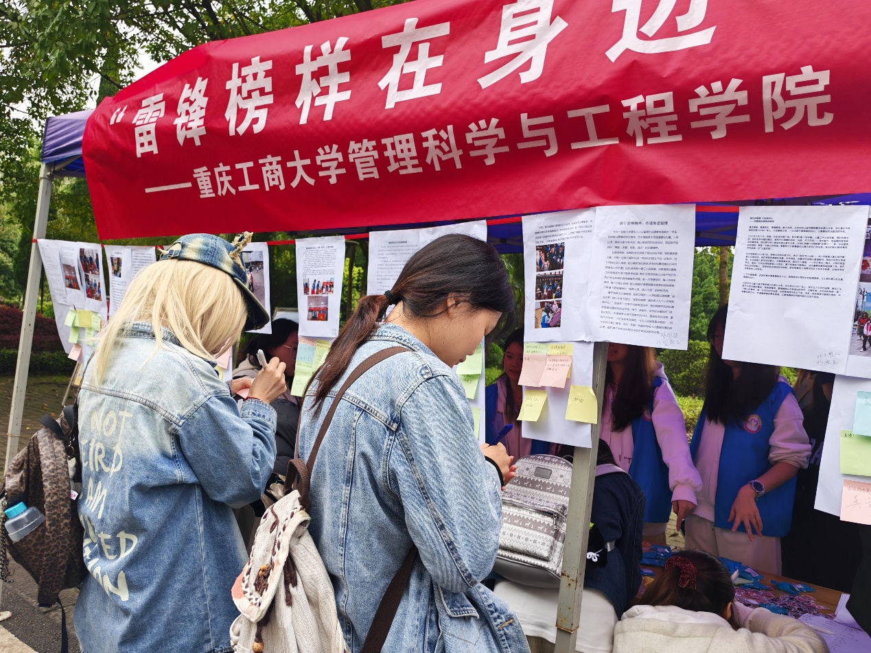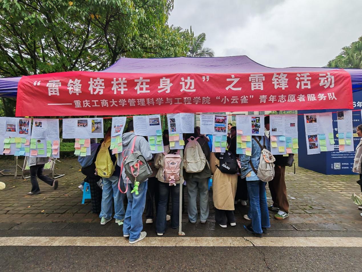 为深刻把握雷锋精神的时代内涵,引导青年学子在日常生活中践行榜样力量,3月23日,重庆工商大学管理科学与工程学院“小云雀”青年志愿者服务队在南岸校区七教门口举办了“雷锋榜样在身边”主题作品展。