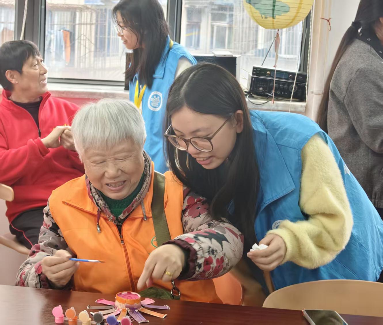 在简单的开场环节结束以后志愿者们便有序地展开了趣味游戏环节,在互动过程中志愿者们也竭尽所能地协助老人们用彩纸和纸杯制作精美的手工画和别出心裁的手工花。每位老人所完成的作品风格都各有不同,或许是唯美的,或许是抽象的,又或许是天马行空的。但有一点每一位老人都是相同的,那就是他们都完全沉浸在自己的创作之中,并且脸上都洋溢着满足的笑容。