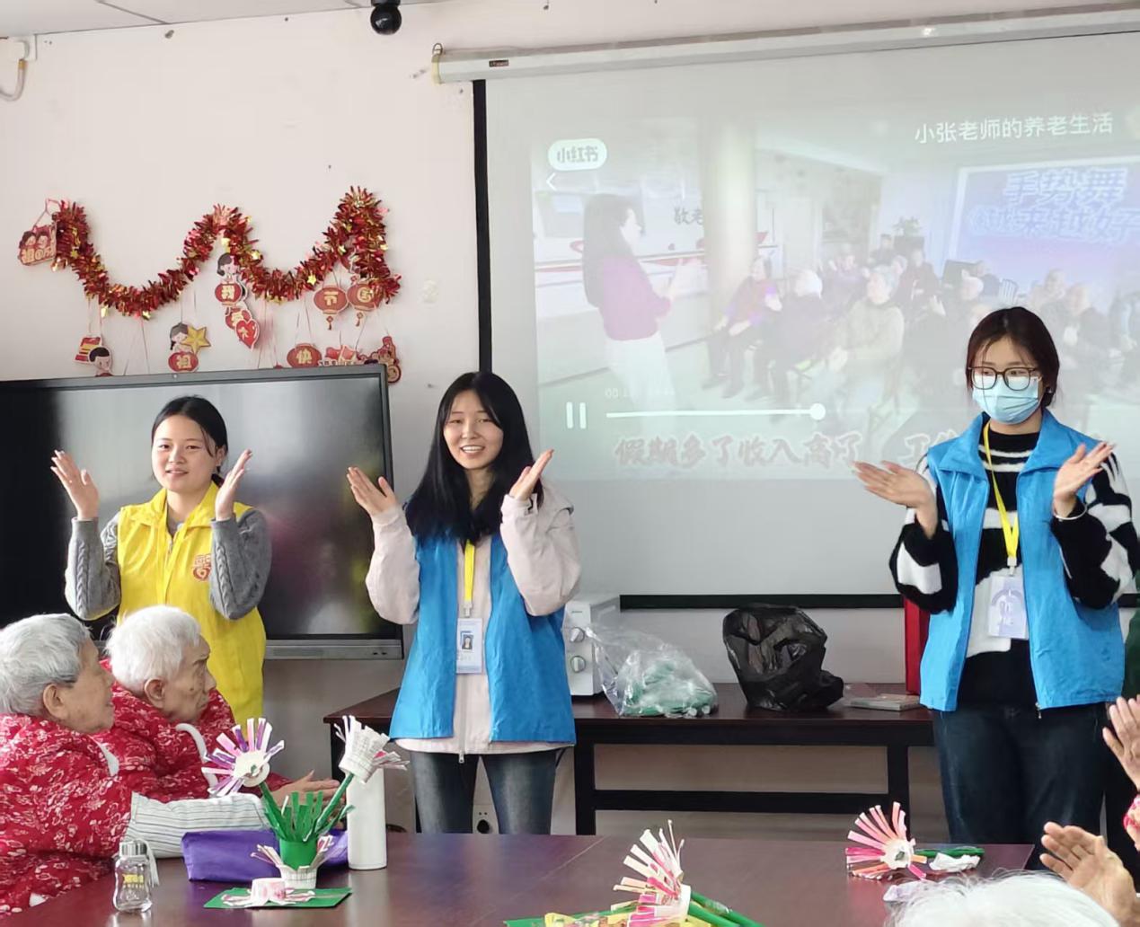 接着便是志愿者们精心准备的文艺表演环节。在有人上台唱歌时,志愿者们便随着音乐开始摆动双手或者小声跟唱,气氛一下子就活跃了。随后的一支手势舞《越来越好》更是将活动的氛围推向了高潮。它那欢快的节奏让活动现场了充满欢声笑语。不少老人在志愿者的热情邀请下甚至从座位上站了起来,跟随着志愿者们的动作开始摆动四肢。这不仅仅让老人在轻松互动中活动了身体、活跃了思维,更让他们重拾了生活乐趣。