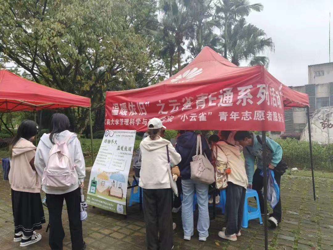 2026年4月14日,重庆工商大学南岸校区暖意涌动。管理科学与工程学院“小云雀”青年志愿者服务队,在博智楼前顺利开展“旧物不旧,温暖依旧”之云雀青E通系列活动。志愿者们以实际行动倡导绿色低碳理念,盘活校园闲置资源,让旧物焕发新生,让公益温暖传递校园。