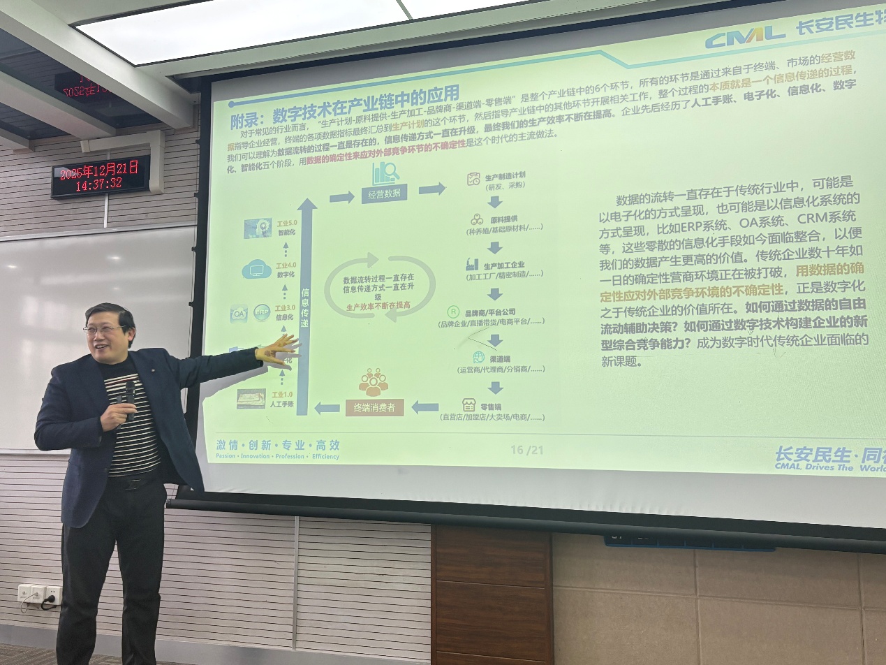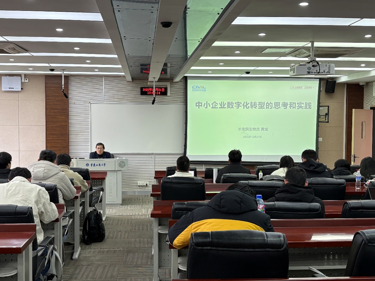 12月21日,我校管理科学与工程学院MEM教育中心在明智楼110306教室成功举办了“企业家进课堂”特色活动。此次活动特别邀请了长安民生物流智慧物流推进中心副总监黄斌先生,为学院硕士研究生带来了一场题为“中小企业数字化转型的思考与实践”的专题分享,现场气氛热烈、反响积极。