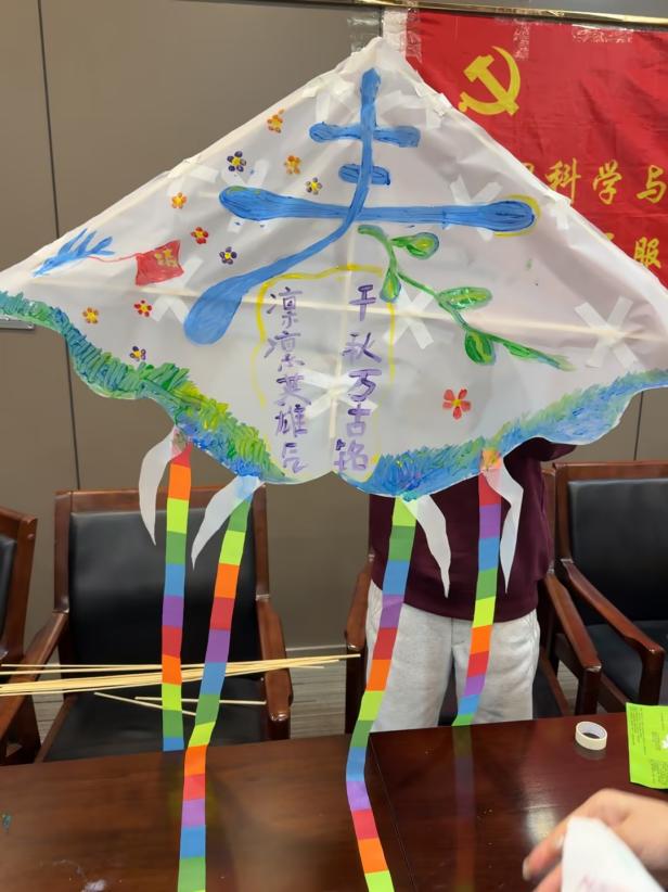 部分小组以党旗、五角星为核心元素,部分绘上英雄剪影与励志标语,还有的将节气意象与红色文化巧妙结合,让普通的纸鸢承载起厚重的精神内涵。现场气氛专注而热烈,同学们相互配合、创意迸发,在动手实践中感受传统技艺之美,在主题创作中厚植家国情怀。